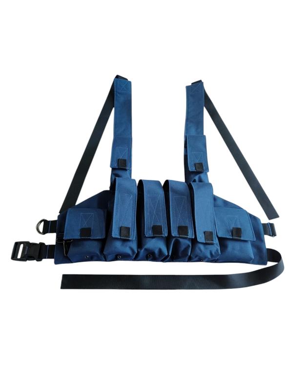 Розвантажувальна система нагрудна закритого типу А для магазинів серії «АК», «РПК», «HK416» місткістю 45-60 набоїв. Система має вісім відділень: 4 відділення для магазинів, 2 відділення для виробів серії «Ф1/РГД-5», «М67/М67-П», два відділення на плечових для рації та турнікету. Відділення закриваються окремими клапанами з велкро. Комплектується карабіном. Розмір універсальний, регулюється стропами. У кожному відділені є отвір для відведення вологи. Колір: Вид 4 Blue Angels синій. Матеріал: Оксфорд 600D PVC WR, водовідштовхуючий.