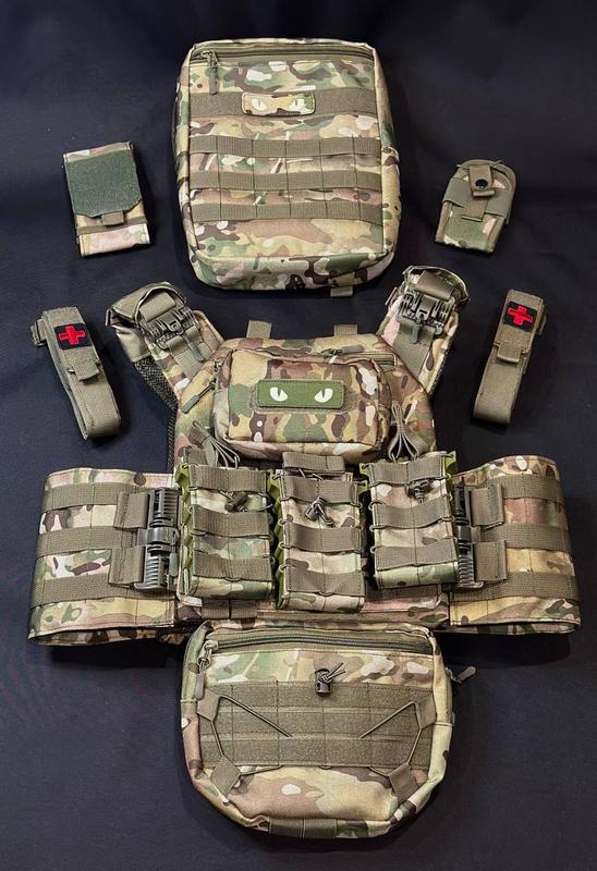 ## Комплект Плитоноска быстрого сброса с боковыми карманами + напашник + 9 Подсумоков VE-33 Шевроны в комплект не входят! В комплекте плитоноска 1 шт Ординарный подсумок к АК с пластиковыми боками 3 шт Рюкзак 1 шт подсумок для плитоноски 1 ш подсумок под турникет 2 шт подсумок для телефона 1 шт подсумок для рации 1 шт Напашник 1 шт боковые карманы под мягкие баллистические пакеты 15*30 см Качественная плитоноска по стандарту НАТО оснащена боковой и верхней системой быстрого сброса, под плиту 25×30 см. - Размер плитоноски универсален, регулируется на плечах и по объему от М до XXL. - С середины прошита 3D сеткой и смягчающей подкладкой, служащей дополнительным демпфером. - Позади оснащена эвукационной ручкой. - По верху прошита системой Molle, позволяющий крепить любые подсумоки и другое дополнительное снаряжение. - По переду вшитая дополнительная карман на молнии для личных нужд. - Бронеплиты вставляются снизу и фиксируются широкой системой липучек, что не даст вашим плитам выпасть. или протереть крепеж. Изготовленная из прочной, водонепроницаемой ткани кордура. Для пошива используется полиамидная стропа. Для ее изготовления используется стойкий к износу, суперпрочный, высококачественный полиамид. Обладает отличными свойствами: высокий уровень прочности, надежный, сможет выдержать большие нагрузки, устойчив к негативному воздействию ультрафиолета, влаги, высоких/низких температур, долговечен. Соответствует требованиям отечественных стандартов качества. Плитоноска прошита армированными нитями, что повышает срок службы изделия. Компактный и легкий рюкзак является незаменимым элементом снаряжения профессиональных военных. Выполненный полностью из прочного, водонепроницаемого материала оксфорд 600d. Основные характеристики: • размер (см): 25/30/10 • крепеж на системе MOLLE • имеет в середине 2 объемных кармана • может использоваться как рюкзак для гидросистемы. • имеет велкро панель для креплений шевронов и патчей. • закрывается на молнию. • дополнительные стропы MOLLE спереди. • усиленные швы • армированные нити Успейте заказать, количество штук по акции ограничено! Остерегайтесь подделок и низкокачественного товара, его сейчас очень много представлено под видом oригинaлa! Мы предлагаем высочайшее добротное качество товара на рынке Украины, который выполняет свою функцию и от которого вы будете получать только приятные эмоции. Почему покупают именно у нас? Отзывы и рекомендации реальных клиентов Наш магазин имеет многочисленные положительные отзывы от довольных клиентов. Вы можете ознакомиться с их опытом и рекомендациями в описании ниже и на нашем сайте, что поможет вам сделать обоснованный выбор. Прозрачность и честность Мы ведем открытую и честную политику в отношениях с клиентами и всегда идем навстречу. Все характеристики товаров, условия гарантии и обмена четко указаны на нашем сайте, что позволяет избежать недоразумений и обеспечивает доверие клиентов. Легкая система возврата товаров Мы понимаем, что иногда товар может не подойти Вам по тем или иным причинам. Поэтому мы предлагаем гибкую и прозрачную систему возврата товаров, что обеспечивает вам спокойствие и уверенность в вашей покупке. Высокий уровень обслуживания клиентов, 10 лет опыта Наши специалисты всегда готовы предоставить профессиональную консультацию и помощь в 