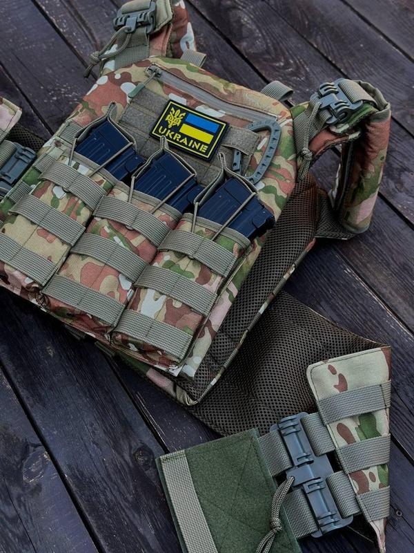 ## Комплект Плитоноска быстрого сброса + Тройной Подсумок Мультикам для АК VE-33 Обращаем Ваше внимание, что фурнитура может отличаться по цвету, в зависимости от партии поставки. Напашник в комплект не входит В комплекте плитоноска 1 шт Тройный подсумок под магазины АК 1 шт боковые карманы под мягкие баллистические пакеты 15*30 см Качественная плитоноска по стандарту НАТО оснащена боковой и верхней системой быстрого сброса, под плиту 25×30 см. - Размер плитоноски универсален, регулируется на плечах и по объему от М до XXL. - С середины прошита 3D сеткой и смягчающей подкладкой, служащей дополнительным демпфером.< br />- Позади оснащена эвукационной ручкой. - По верху прошита система Molle, позволяющая крепить любые подсумоки и другое дополнительное снаряжение. - По переду вшита дополнительная карман на молнии для личных нужд. />- Бронеплиты вставляются снизу и фиксируются широкой системой липучек, что не даст вашим плитам выпасть или протереть крепеж. Изготовлена из прочной, водонепроницаемой ткани Кордура 900D. Для пошива используется полиамидная стропа. br />Для ее изготовления используется стойкий к износу, суперпрочный, высококачественный полиамид. Обладает отличными свойствами: высокий уровень прочности, надежный, сможет выдержать большие нагрузки, устойчив к негативному воздействию ультрафиолета, влаги, высоких/низких температур, долговечен. Соответствует требованиям отечественных стандартов качества. Плитоноска прошита армированными нитями, что повышает срок службы изделия. Успейте заказать, количество штук по акции ограничено! Остерегайтесь подделок и низкокачественного товара, его сейчас очень много представлено под видом oригинaлa! Мы предлагаем высочайшее добротное качество товара на рынке Украины, который выполняет свою функцию и от которого вы будете получать только приятные эмоции. Почему покупают именно у нас? Отзывы и рекомендации реальных клиентов Наш магазин имеет многочисленные положительные отзывы от довольных клиентов. Вы можете ознакомиться с их опытом и рекомендациями в описании ниже и на нашем сайте, что поможет вам сделать обоснованный выбор. Прозрачность и честность Мы ведем открытую и честную политику в отношениях с клиентами и всегда идем навстречу. Все характеристики товаров, условия гарантии и обмена четко указаны на нашем сайте, что позволяет избежать недоразумений и обеспечивает доверие клиентов. Легкая система возврата товаров Мы понимаем, что иногда товар может не подойти Вам по тем или иным причинам. Поэтому мы предлагаем гибкую и прозрачную систему возврата товаров, что обеспечивает вам спокойствие и уверенность в вашей покупке. Высокий уровень обслуживания клиентов, 10 лет опыта Наши специалисты всегда готовы предоставить профессиональную консультацию и помощь в выборе товара. Мы ценим каждого клиента и стремимся сделать процесс покупки максимально комфортным и приятным. Быстрая доставка и удобные условия оплаты Мы предлагаем быструю и надежную доставку по всей стране, а также разнообразные способы оплаты, включая наличный и безналичный расчет. Наши клиенты могут выбрать наиболее удобный для себя способ получения товара. ✅ Весь товар проверяется на наличие брака перед отправкой ✅ Отзывы наших клиентов Поторопись, товара по акции осталось всего 3шт! ✅ С заботой о каждом клиенте ✅ ДОСТ