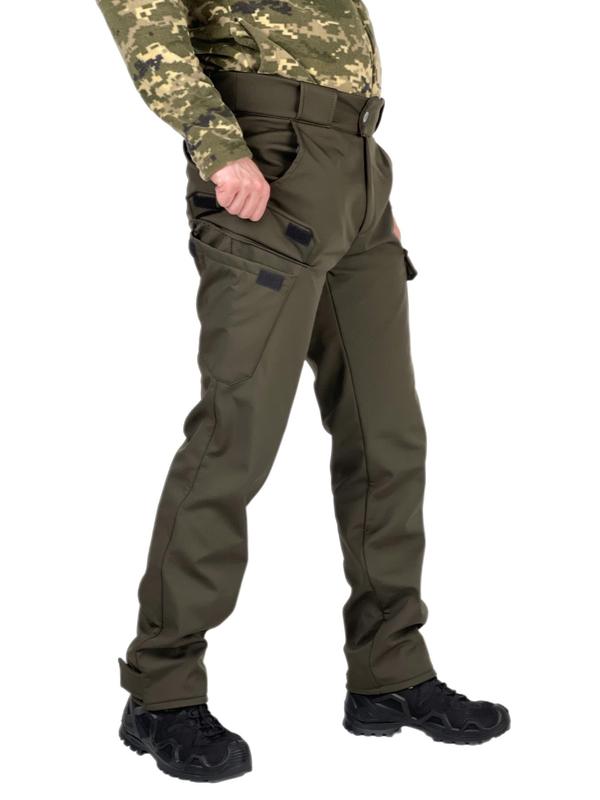 Материал верха: soft shell. - Внутри приятный, мягкий флис. - В изделии 6 карманов (2 прорезных стандартных, 2 кармана сзади и 2 боковых на липучках). - Пояс несколько повышен. Есть шлейки под ремень - Внизу штаны фиксируются с помощью липучек. - Размеры: S M L XL XXL 3XL