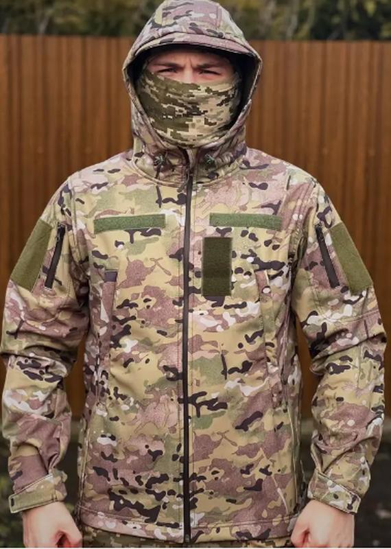 Куртка прямая, застежка центральная на молнию, воротник-стойка, также есть капюшон, рукава - на манжетах, которые регулируются с помощью липучек. Удобный капюшон, возможность регулировки капюшона затяжками. Модель куртки предусматривает наличие карманов для удобства пользования. Нагрудные карманы имеют боковые застежки на молнию. Два дополнительных кармана на рукавах. Велкро (липучки) для крепления шевронов размещены над карманами в области груди, а также на рукавах. Подкладка - флис. Отлично согреет и придаст комфорта зимой, а также прохладной осенью. Ткань Soft Shell сочетает в себе теплоизолирующие и "дышащие" свойства ветро- влагостойкость, прочность наружного слоя. Наружная поверхность блокирует ветер, а внутренний слой ткани отводит избыточную влагу. Используется в качестве верхнего слоя в условиях межсезонья и зимой. Soft Shell: *Снаружи - относительно плотная тонкая ткань обычно из полиэстера, и умеренно тянется в разные стороны во время движения. Дополнительно Soft Shell обычно обрабатывают DWR пропиткой, обеспечивающей защиту от влаги. *Посредине - мембрана, дающая дополнительную защиту от влаги (мембрана есть не во всех разновидностях Soft Shell)