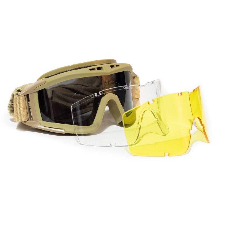 •На оправе предусмотрены мягкие накладки для большего комфорта. Вентиляционные отверстия прикрыты поролоном, который не пропускает грязь внутрь. •Широка резинка крепко держит очки на шлеме. •В комплект входить: -Очки -Прозрачное стекло -Желтое стекло -Черное стекло -Сумка с креплением на ремень для транспортировки