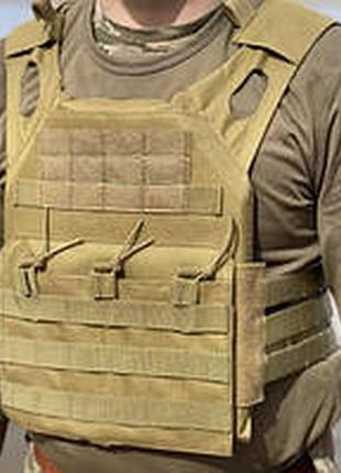 Плитоноска цвет койот Материал: Cordura 1000D Характеристики: - Комплектация: - Подсумки под автоматные магазины - Под плиты 25*30см, спереди и сзади. - Регулируется по обхвату и высоте. - Грудная часть жилета и спина оснащены демпферной дышащей сетчатой тканью.