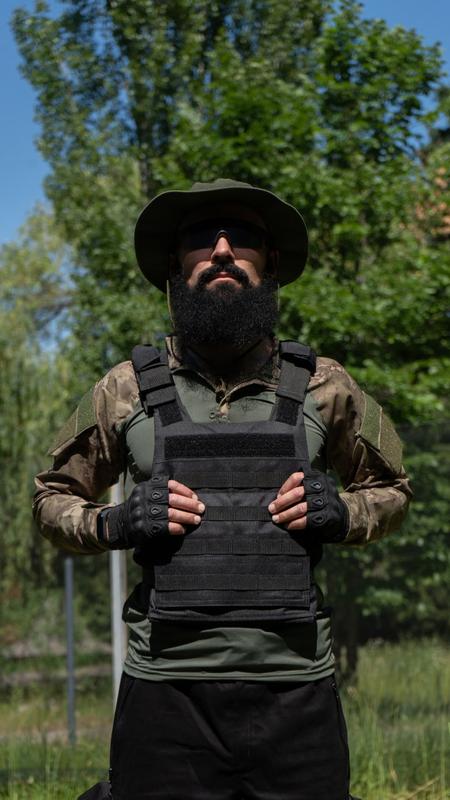 Плитоноска НАТО Колір: пісок (світла олива), чорний Виробник: TM "TUR", Україна Матеріал: основний матеріал - польска Кодура, плетіння 600D, ремінна стрічка поліамід, резинка - полієстер Особливості: плитоноска під стандартну плиту 25х30, плита вставляється знизу, має подвійне кріплення на велкро. Полегшений варіант із сіткою сбоку. Плечовий демпфер. По об'єму регулюється за допомогою шнура резинки (виставляється один раз) та велкро на передній частині. Є велкро для кріплення шевронів, евакуаційна петля посилена закріпками. В комплекті до плитоноски іде тройний підсумок під магазин АК.