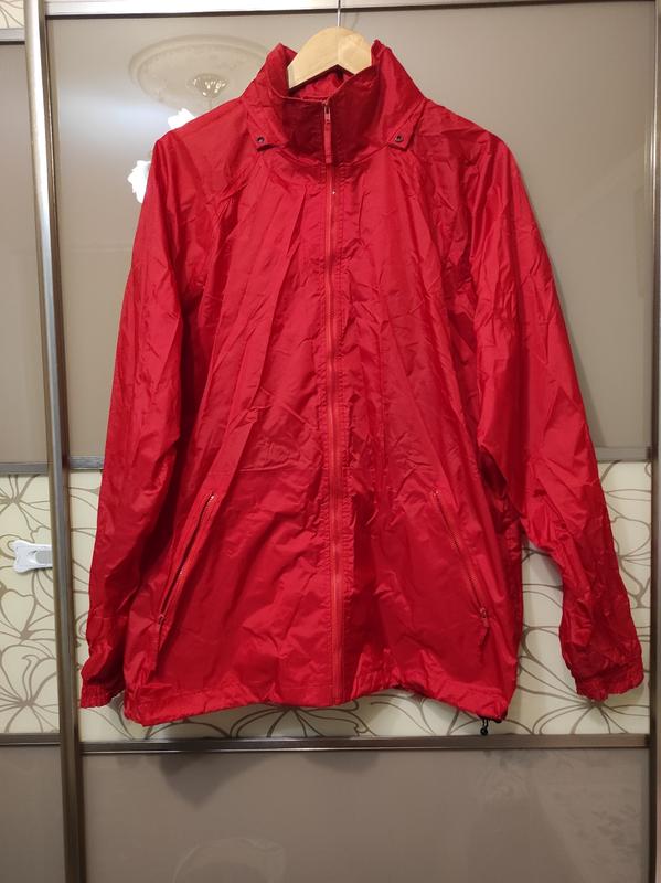класна курточка, на сильний дощ не підійде, хіба на легенький. іде з мішечком, зручно носити з собою, можна прикріпити до рюкзака. є кілька плям, виводити не пробувала (два останні фото). пог - 63 см; довжина - 76 см; плечового шва немає; рукав від горла - 82 см.