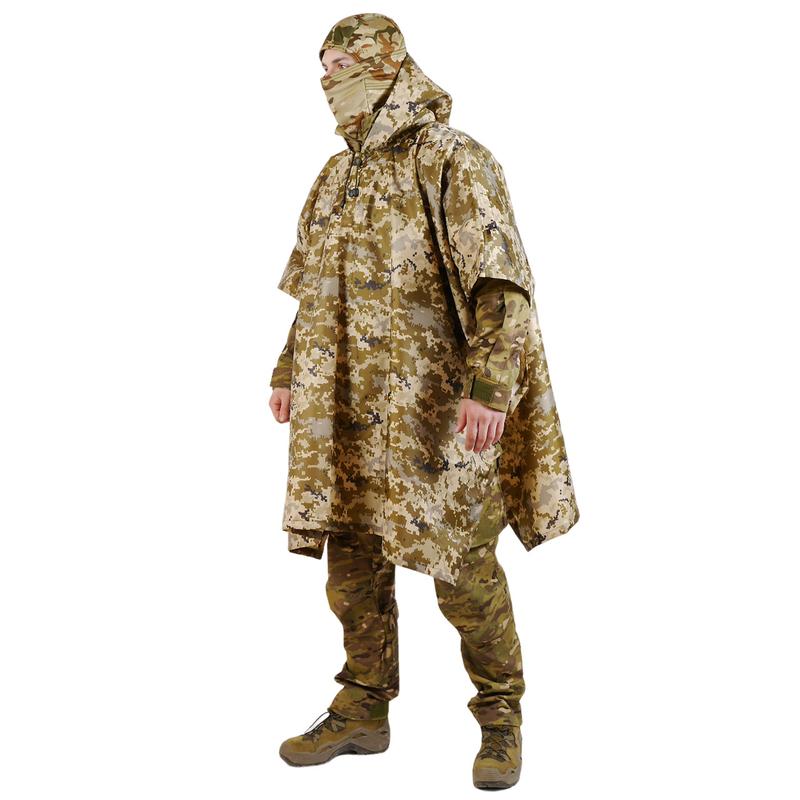 Пончо изготовлено из водонепроницаемой плащевки плотностью 110г/м². Швы проклеены специальной термопленкой! Идеально подходит для военных нужд благодаря своей пиксельной окраске. Прикрывает руки, тело и большую часть ног. Пошив пончо позволяет его одевать поверх одежды и амуниции. Имеются дополнительные резинки на рукавах для фиксации изделия на руках. Достаточно объемный капюшон позволяет его одевать поверх шлема и имеет резинку для его регулировки на голове. Вместе с высоким воротником капюшон дополнительно защищает от ветра. Размер изделия 1,40м/1,05м В комплекте есть сумка-мешок, за счет которой достаточно удобно носить пончо с собой и легко уложить в рюкзак.