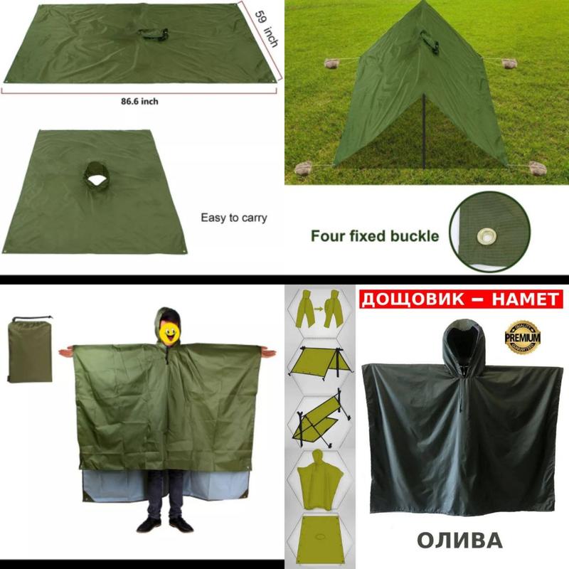 Плащ, пончо, палатка, двухцветный Характеристики • 100% водонепроницаем! • Материал: Плащевка с пропиткой; Подкладка серебристая Размер: В развернутом виде длина 2 м 12 см Ширина в развернутом виде 1 м 42 см В свернутом виде длина впереди 90 см, сзади 1 м 22 см • Чохол у комплекті; • Цвет: Олива-Хаки, серебро. Возможно использовать как палатку. Рукава крепятся липучками. Утяжка на капюшон. Имеет закрепление по швам и люверсы по периметру.