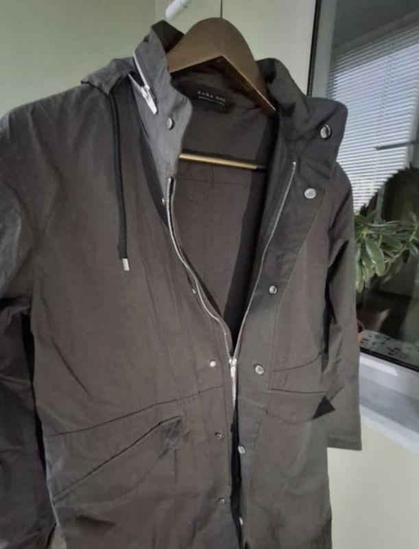 Дождевик от Zara Данная модель имеет 2 боковых кармана, капюшон (можно сложить в воротничок), без подкладки и утеплителя Цвет хаки Размер S-М Замеры: плечи - 47см ПОГ - 52см ПОБ - 55см Длина отд воротничка - 96см Длина рукава от плеча - 63см Стан - идеальный