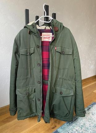 Куртка-парка з підкладкою зі штучної вовни на спині і капюшоні. Внутрішня стьобана підкладка. На блискавці та є гудзики. Є дефект на лівому кармані, тому така ціна. Його можна ліквідувати невеликою нашивкою. Заміри (розмір М) Об. груди: 96-101 Об. талія: 81-86 Об. бедра: 96-101