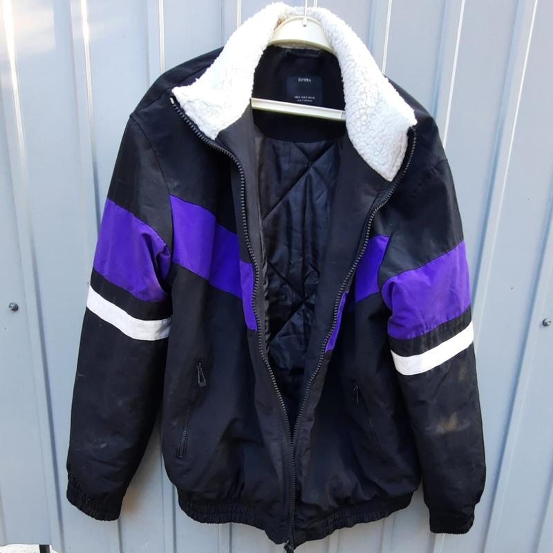 Стан б/у,на мой взгляд идеален.Замеры:полуобхват груди-67см,плечи-57см,длина по спине-71см,длина рукавов-68см,длина внутреннего шва рукавов-52см,Bershka,size-XL,верх-85 %polyester,15%cotton, подкладка-100 %polye, inmade Ionesia.