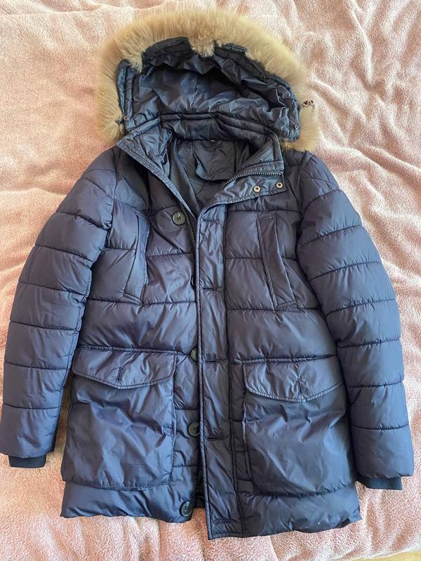 Зимняя куртка мужская, по бирке М, реально на С, замеры Плечи 42 Пог 51 Длина полностью 75 Рукав от плеча 66 Капюшон отстегивается, мягко отдельно снять мех Цвет темно синий Наполнитель синтепон Стан замечательный.на последнему фото есть небольшой нюанс