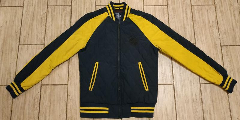 Яркий стёганый бомбер для подростка. В очень хорошем состоянии. Длина по спинке 65 см ПОГ 52 см ПОБ 45 см (резинка) Рукав реглан длина от воротника 78 см Есть два внутренних кармана Есть нюанс ((фото 4) маленькая пропаленная дырочка