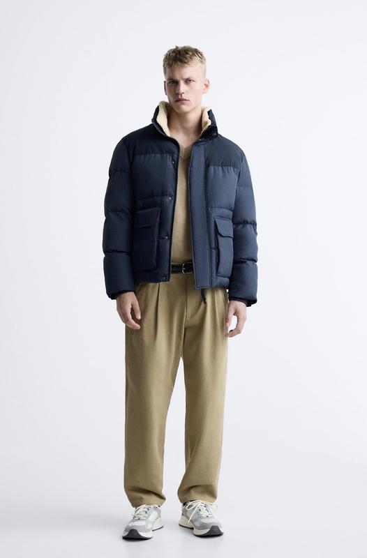 Куртка чоловіча (Zara) Розмір L, темно-синього кольору з відчіпним коміром на кнопках Склад: верхня частина: 80% поліамід, 20% бавовна; нижня частина: 100 поліестер; підкладка: 100% поліамід; наповнювач: 100 % поліестер.