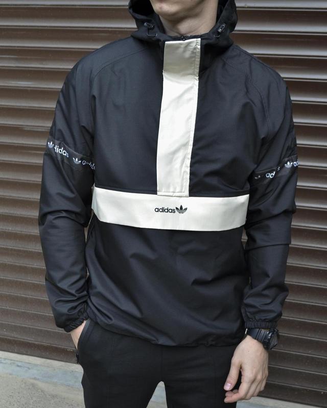 Анорак Adidas Розміри: S, M, L, XL - Колір: чорний з бежевою вставкою - Матеріал: плащівка на трикотажній основі - Брендовий лампас на рукавах - Містка кишеня під планкою - Капюшон і низ анораку регулюється затяжками