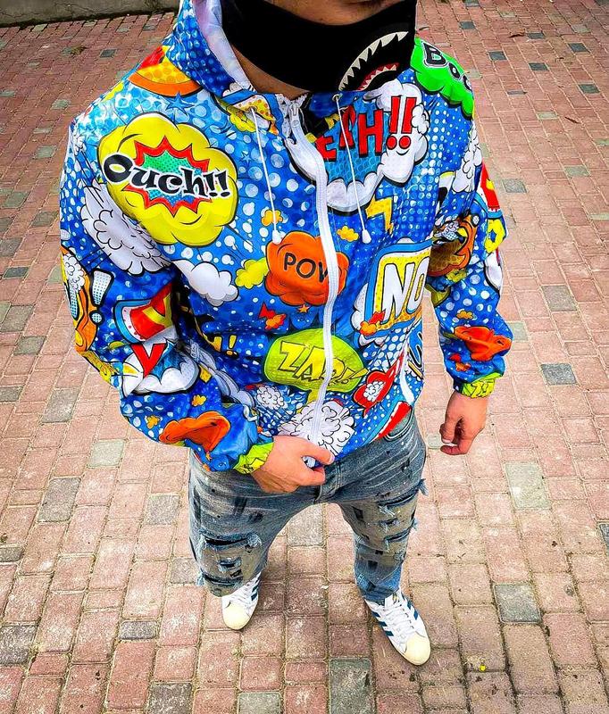 Яркая осенняя ветровка комикс Мужчины всегда предпочитают комфорт и удобство, именно этими качествами обладает ветровка. Она хорошо защитит от ветра и при этом в ней совсем не будет жарко, вы с удовольствием будете носить ее в переходный период года. В качестве застежки в ветровке используется молния. - Ткань: ветро/влагозащитная плащевка - Материал: турецкий коттон 95% еластан 5% - Рукава и низ на манжетах - При стирке не изменит свой цвет С нашей размерной сеткой Вам будет легче подобрать размер Для более точного подбора размера укажите рост и вес Рекомендации по уходу: - Использовать только жидкое средство для стирки - Стирать при температуре воды - 30-40 - Не следует использовать кондиционеры или отбеливатели - Не использовать функцию сушки Преимущества работы с нашей компанией: - Обмен и возврат товара без проблем - Никаких предоплат если в заказе не больше двух позиций - Отправка наложенным платежом либо по полной оплате, как вам удобно!