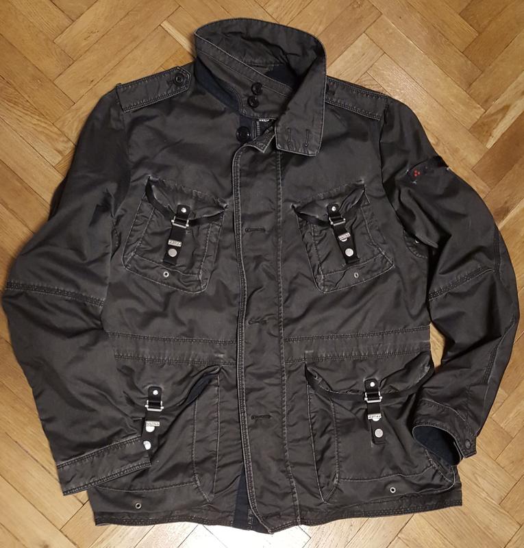 Куртка PEUTEREY, розмір L Незначне б.в. колір темно-сірий, трошки штучно зістарена 4 кишені, Матеріал поліамід-поліуретан Типу вітрівки-дощовика плечі 47 см груди півобхват 58 см рукав 65 см, внутрішній шов 51 см довжина 76 см