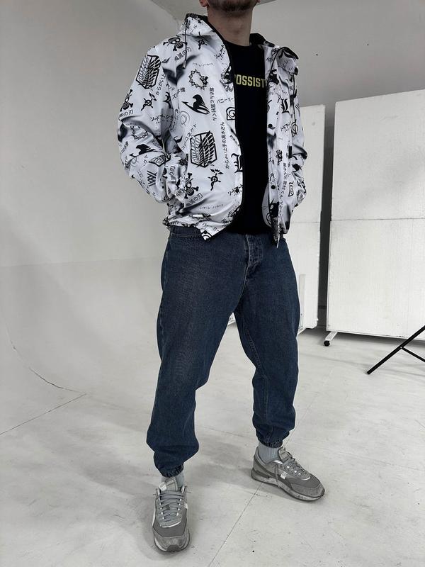 Белая мужская ветровка с ярким принтом, демисезонная куртка с капюшоном