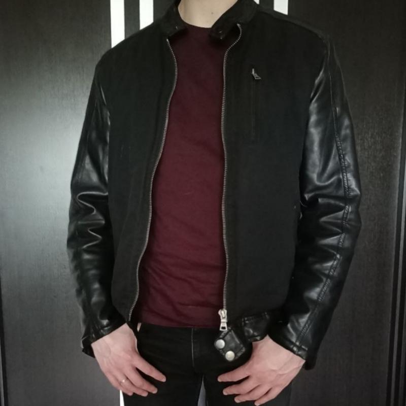 Современная мужская куртка, очень удобная и качественно сшитая. Минималистичный крой, с воротником-стойкой. Тканая/шитая подкладка. Материал комбинированный - плотный джинс-текстиль + кожзаменитель. Состояние 4/5, красивый. Единственный нюанс- немного потрескался кожзаменитель на внутреннем воротнике. Видно на фото. Можно у ателье недорого отремонтировать, по желанию. Размер M/L. За дополнительными замерамитрянян обращаться.