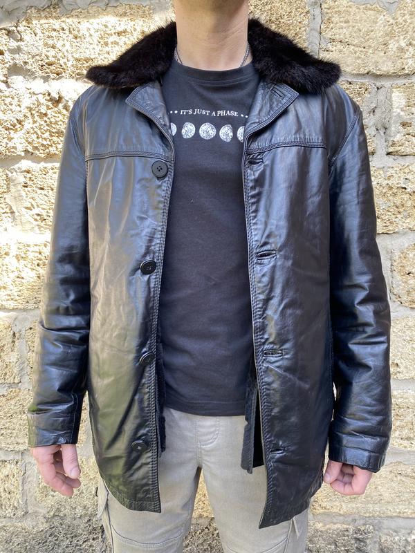 Кожаная зимняя мужская куртка. Меховая подкладка емкая,так как и меховой воротник. Длина -76см Ширина 56 см Длина рукава 77см