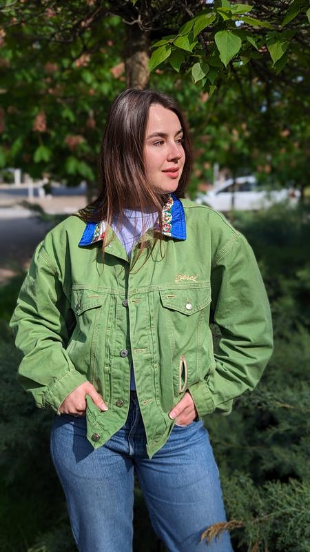 Абсолютно уникальная кастомизированная джинсовка от DIESEL. Оригинальный made in Italy, на котором я перешила воротничок. Неповторимый салатовый цвет с пастельно-желтой отстрочкой. Такая будет только у вас 🤗 Надежно на М. Хорошо сядет на с-м в качестве оверсайза. Мои параметры 90-70-100, 168 Модель 5355, D708555