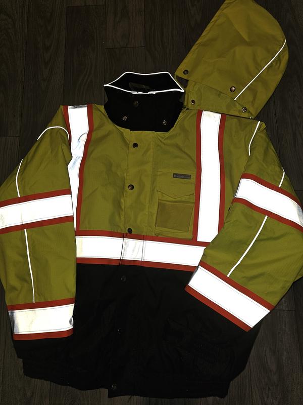 Прочный материал рипстоп с водонепроницаемой конструкцией проклеенных швов. Съемная черная стеганая подкладка. Скрытый воротник-капюшон. Светоотражающий материал 3M™ Scotchlite™ шириной 2 дюйма и контрастностью 3 дюйма. Светоотражающая окантовка Brilliant Series на воротнике, плечах, капюшоне и швах рукавов. Регулируемые манжеты. Черный низ спереди и рукава для сохранения опрятного внешнего вида. Карманы Левый нагрудный карман с выдвижным прозрачным держателем для удостоверения личности. На левом бицепсе двухсекционный карман для карандашей/ручек. Два наружных нижних прорезных кармана на молнии. Внутренний карман кошелька.