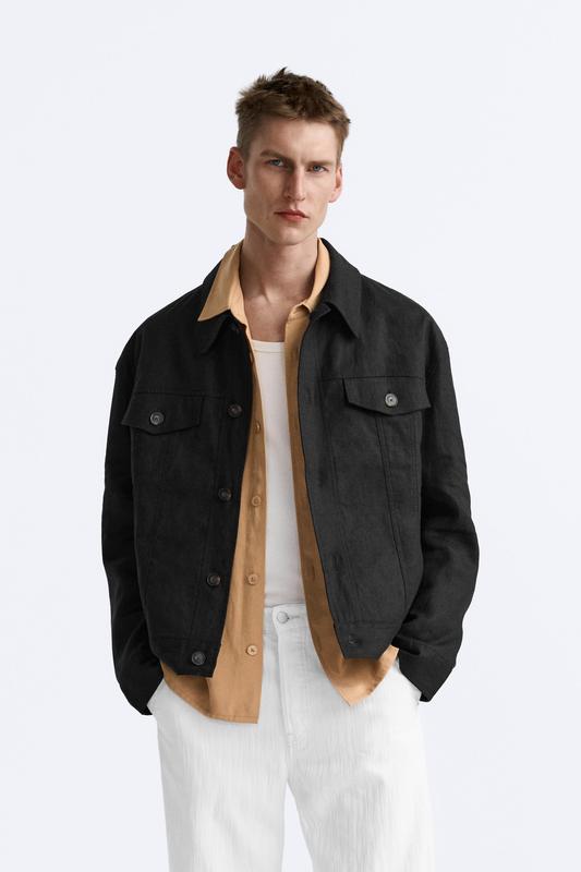Льняная куртка с рубашечным воротником и длинными рукавами. Застегивается на пуговицы спереди. Карманы с клапаном на груди и пуговицы на манжетах Размер по набору XL, лучше будет сидеть на L Длина по спине 64 см Плечи 58 см Груди 61 см Рукав от плеча 59 см (от воротника 80 см) Снаружи 100% лён Подкладка 100% хлопок Цвет черный