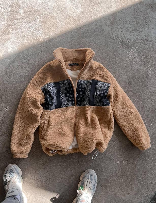 Чоловічий бежевий плюшевий бомбер з принтом модна чоловіча легка куртка бомбер
