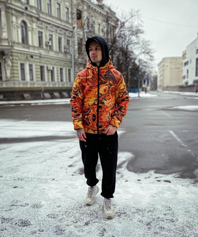 Помаранчева чоловіча куртка з яскравою абстракцією