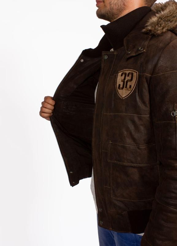 Мужская кожаная куртка утеплена синтепоном на замке с капюшоном от бренда Mustang. Mun-13-229