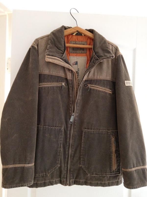 Очень красивая куртка, в груди 63 см, длина 79 см, рукав 66 см. Бирки с размером нет. Не секонд, носили мало. Из недостатков - расстояется фото.