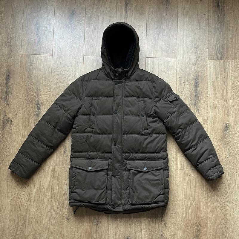 Зимова тепла куртка. Набивка синтепон. В карманах флисовая подкладка. Застежка на молнию. Манжети на рукавах. Боковые карманы и грудные карманы на кнопках. Плечи 47 Груди 56 Рукав 68 Длина 82