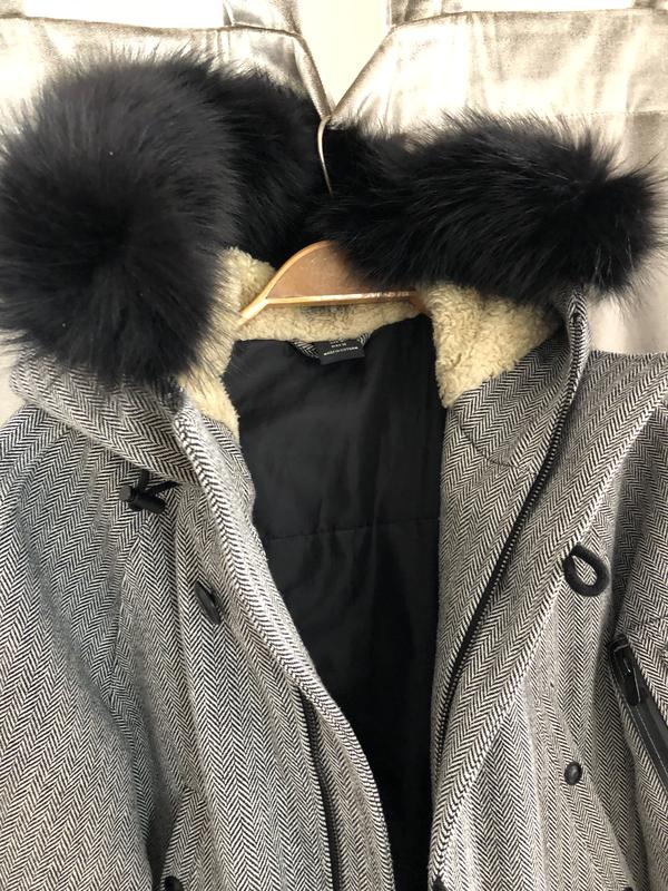 Стильная зимняя куртка, на замке и пуговицах... мех натуральный, снимается 4 внешних кармана на застежках и один внутренний, в середине куртки есть шнурок для стяжки, принт в елочку