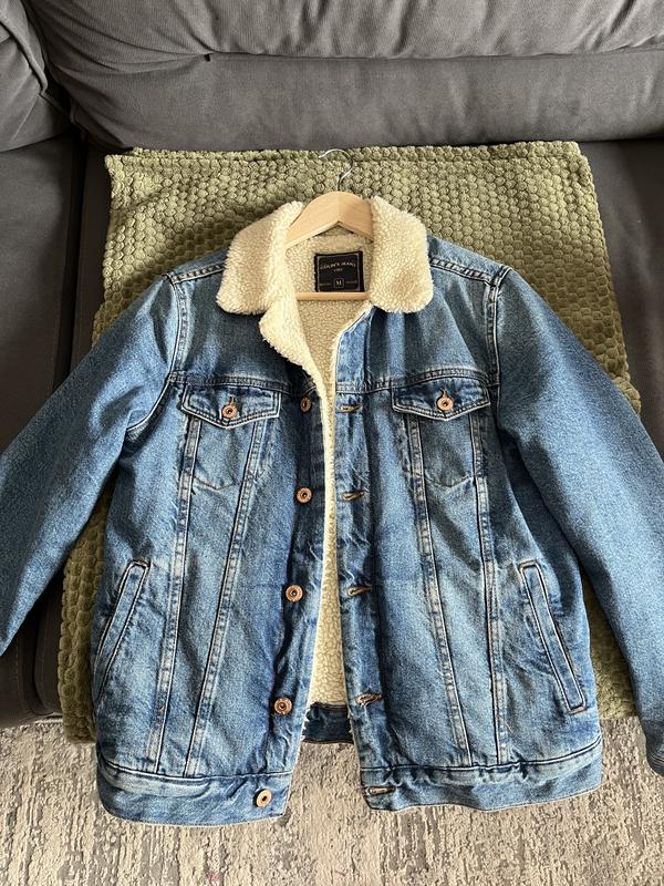 Утеплена чоловіча джинсовка розміру М, колір синій. Розмір у заміській, міжнародній та українській системах: 38 / M / 46. Підходить на теплу зиму