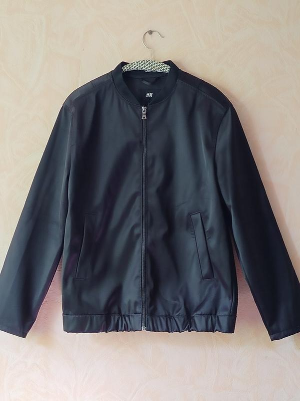 Тренд сезону ! Бомбер мужской от H&M! Длина изделия по спине 68см плечи 46см, рукав 59см полу объем груди 55см по низу 46 +7см Плотная ткань- прорезиненная, не продувает, не промокает. Имеет вид шелковой ткани. Хорошо держит форму, без подкладки, имеет боковые карманы, низ бомбера на резинке.