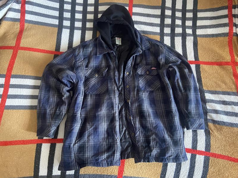 Dickies куртка-рубашка с капюшоном Оригинальная рабочая куртка-рубашка Dickies в синем клетчатом принте. • Размер: 3XL (оверсайз) • Подкладка + капюшон из плотного материала • Застёжка на молнию и кнопки • Два нагрудных кармана на клапанах • Универсальная вещь: можно носить как лёгкую куртку или тёплую рубашку Состояние отличное.