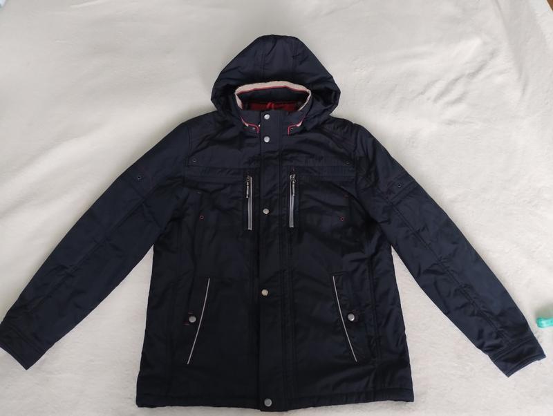 Куртка 54р темно-синего цвета в идеальном состоянии, имеет съемный капюшон, все застежки работают. Замеры: длина 77 см, ширина плечи 50 см, длина рукава 67 см, объем груди 122 см, ширина низа 60 см. Есть возможность примерки в м. Калуш Ивано-Франковская область.