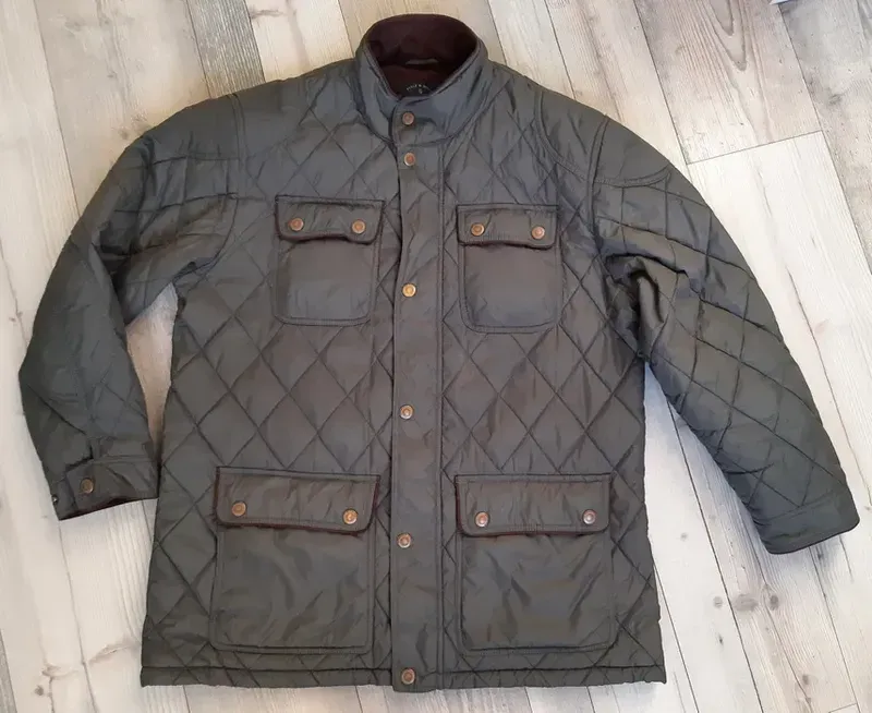 Куртка легкая, тонкая, элегантная, качественная. В отличном состоянии. Защелка: молния, кнопки. Спереди четыре кармана. Манжеты рукавов регулируются кнопками. По бокам сзади короткие пояски для регулировки. Есть два внутренних кармана на молнию. Темно-зеленый цвет. Размер XL/ mex.42 Замеры: Длина куртки спереди от горловины-67 см Длина сзади-78 см Плечи-51 см Ширина (от подмышки до подмышки)-62 см Длина рукава-60 см Вн.шов рукава-45 см. Полностью соответствует фото!