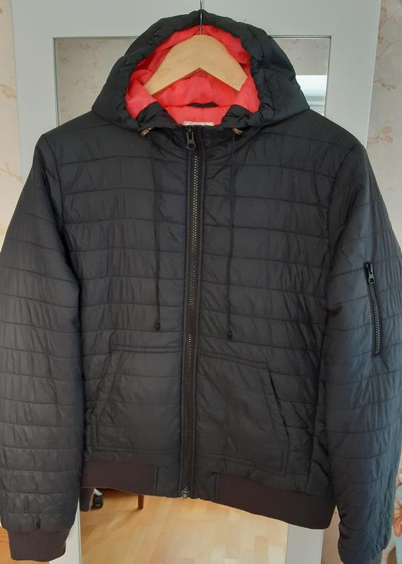 Легка чоловіча демісезонна куртка серого кольору. Модель стьобана горизонтальними рядками та має прямий крій. Усередині — яскрава контрастна підкладка розового кольору, яка добре видно в зоні капюшона.Заміри: груди 58см,рукав 67см,довжина 60см,плечі 44см Куртка оснащена: капюшоном з регульованими шнурками; центральною блискавкою; двома фронтальними кишенями; кишенею на блискавці на лівому рукаві; еластичними манжетами та поясом для кращого прилягання.