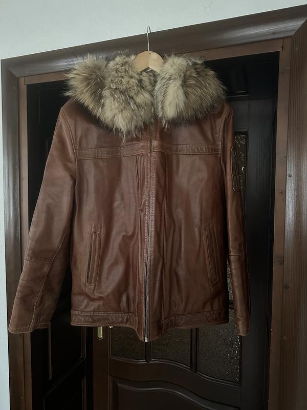 Надзвичайно стильна.Верх-мʼясиста,але мʼяка шкіра,є капюшон (відчіпається),круте пошиття.Без дефектів-немає дірок,плям та інше.Заміри:напівокружність грудей 63 см,напівокружність низу 60 см,довжина виробу 73 см,довжина рукава 65 см,плечі 56 см.Куртка утеплена натуральним хутром .Хутро є на комірі та капюшоні.Ця річ для сміливих та стильних.