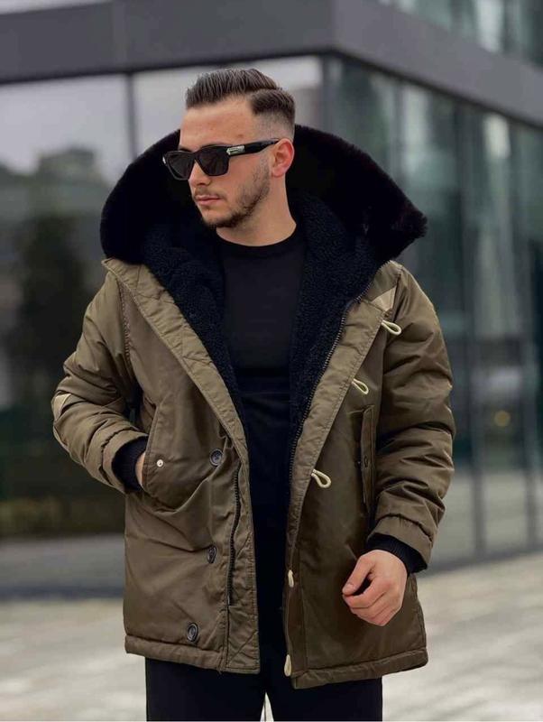 Не підійшов розмір , стан новий Чоловіча зимова куртка-парка Зовні виконана з щільного водонепроникного та вітрозахисного матеріалу. Крій куртки напівприталений, рукави з щільними манжетами. Утеплювач — штучне хутро з імітацією овчини чорного кольору; капюшон вшитий, з штучним хутром, крій «під горло і вище», хутро від капюшона не відстібається. Нижні кишені — прорізні, на кнопках; також є внутрішня кишенька. Характеристики: • Тканина: 90% поліефірне волокно + 10% бавовна • Додаткові матеріали: 100% поліестер • Підкладка: 100% поліефірне волокно Розмір (зовнішні заміри виробу): XL: ширина плечей — 54 см, обхват грудей — 125 см, довжина — 79 см, рукав — 66–68 см, рекомендація — 180–190 см / 90–100 кг