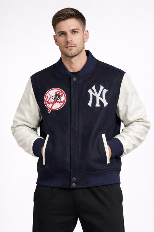 Темно-синя університетська куртка NY Yankees Game Day Classics - Матеріал: Вовняний боді та рукави з натуральної шкіри - Внутрішня частина: віскозна підкладка - Колір: темно-синій/білий - Комір: Ребристий трикотаж - Передня частина: Застібається на блискавку з ґудзиками - Рукави: Рукава повної довжини - Манжети: Ребристе в'язання - Ребристий трикотаж - Кишені: Дві зовнішні кишені та дві внутрішні кишені Розмір - M ОГ 110 см