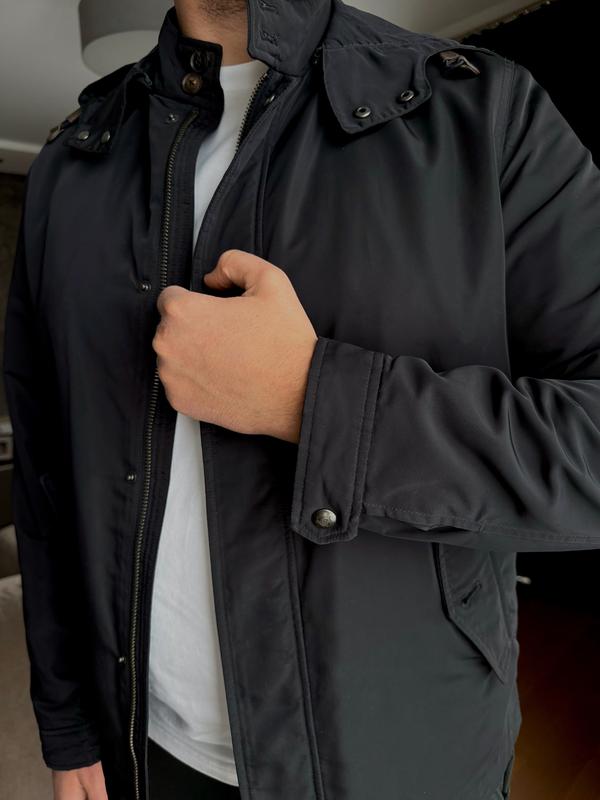 Стильна чоловіча куртка від преміального бренду Massimo Dutti в універсальному темно-синьому кольорі. Особливості: • Подвійна застібка: блискавка + кнопки для надійного захисту • Знімний капюшон з регулюванням • Комір-стійка для додаткового комфорту • Функціональні бічні кишені на блискавках • Матеріал: 100% поліестер • Розмір: XL Стан: дуже хороший, без дефектів. Заміри: довжина по спині - 70 см; довжина рукава - 69 см; плечі - 49 см; напівобхват гру дей - 60 см.