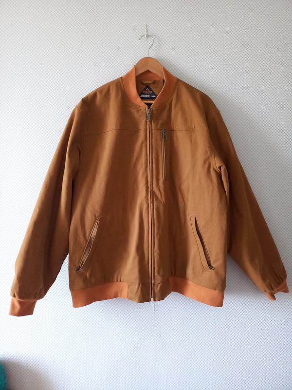 Мужской бомбер охристого цвета от американского производителя качественной рабочей и верхней одежды. Верх куртки выполнен из плотной хлопковой ткани. Внутри подклада и тонкий синтепон. Имеет внешние карманы и внутренние. Качественная фурнитура YKK. Бирка со составом отсутствует. Стан идеален. Размер по набору L. Замеры: под руками - 67см, плечи - 54см, рукав - 68см, длина по спинке - 74см.