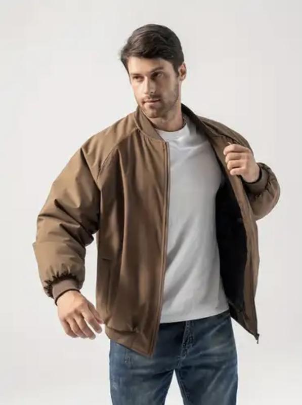 чоловіча куртка-бомбер коричневого кольору, яка, виготовлена з матеріалу, що імітує замшу. Вона має класичний дизайн куртки-бомбера з ребристими манжетами та нижнім краєм, коміром-стійкою та застібкою-блискавкою спереду. Плечі 55 Пог 68 Довжина 70 Рукав 65 По низу 62 Стан чудовий