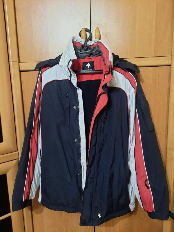 Теплая современная куртка для мужчин спортивного стиля для демисезона с капюшоном и разнообразными карманами, резинками, липучками, стяжками для удобного пользования. Цвета яркие - черный, красный и белый (камера слегка меняет цвета). Застежка молния + кнопки. Размер 52-54. Замеры: длина 75 см, грудь 65 см, рукав 63 см. Все ловко работает. Стан хороший.