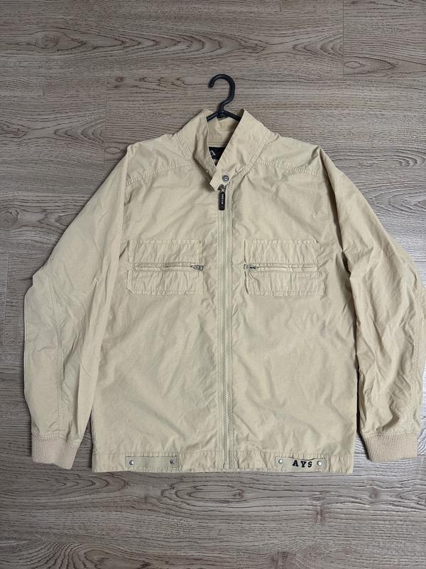Світла чоловіча куртка-бомбер у бежевому (пісочному) відтінку. Модель прямого крою, застібається на блискавку по всій довжині. 🔹 Комір – невисока стійка на кнопці. 🔹 Кишені – дві нагрудні з клапанами та горизонтальними блискавками; також є бокові врізні кишені. 🔹 Манжети – трикотажні, еластичні. 🔹 Низ куртки – з регулювальними хлястиками на кнопках, справа є невеликий напис «AYS». 🔹 Матеріал – легка плащова тканина, виглядає як вітровка (тонка, без утеплення). Довжина по спині 67–68 см. Куртка виглядає стильною та універсальною — підійде для весни або прохолодного літа, добре поєднуватиметься з джинсами чи чіносами.