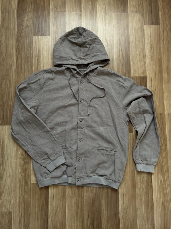 Легка куртка-сорочка з капюшоном 🔹 Застібається на ґудзики 🔹 Є капюшон зі шнурками 🔹 Дві зручні кишені спереду 🔹 Манжети та низ на м’якій трикотажній резинці 🔹 Колір – сірий Тканина 60% рамі, 40% бавовна