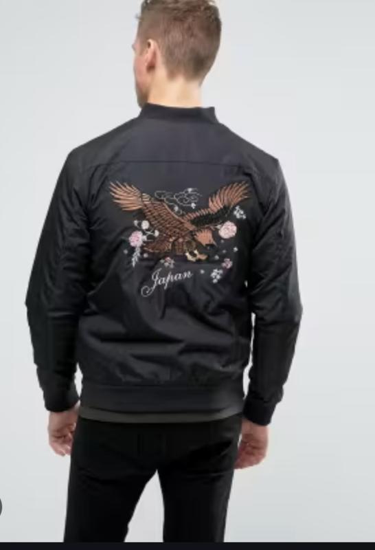 Мужская куртка с вышивкой в виде птиц на груди.Мвеет классический черный цвет.Длина 63см.Рукав 65см.Пог 54см.Пот 45см
