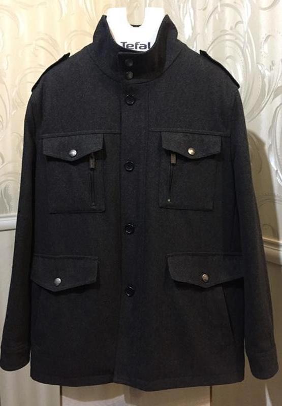 Утеплена куртка/півпальта сірого кольору, прямого крою, комір-стійка (комір застібається на дві кнопки), попереду два нагрудних кишені з клапанами на кнопках і поздовжні прорізні на блискавці і дві прорізні бічних кишені з клапанами на кнопках і два косих кишені, всередині один внутрішній кишеню на кнопці, на плечах погони, рукава на манжетах (застібаються на кнопки), повністю на утепленій стьобаною підкладці, застібається на гудзики, на всю фурнітуру нанесений логотип бренду. Бренд MICHAEL KORS. Состав: изделие - 55% шерсть, 35% полиэстер, 10% другие волокна; подкладка - 100% полиэстер; утеплитель - 100% полиэстер. Размер L. Состояние б/у, очень хорошее, без дефектов, пятен, катышек и т.д., в чистке не нуждается. Следы носки видны на фурнитуре (см.фото). Замеры: плечи - 49/50 см., ПОГ - 62 см., ПОБ - 61 см., длина от плеча - 79 см., длина рукава с учетом манжета: внешняя - 65 см., внутренняя - 50 см. Добро пожаловать в мой магазин. Известные бренды, отличное качество - доступные цены.