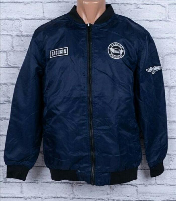 Новое. Цена снижена, есть нюанс- на спинке ( последнее фото) на некоторых буквах местами нет краски. Плащевка, без утеплителя, есть 1 внутренний и 2 наружных кармана. Темно- синяя. Длина 70см, плечи 48см, рукав 61см, пог 55см